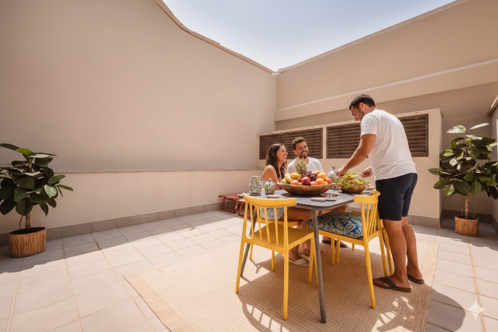This spacious 2 bedroom apartment with 2 bathrooms offers a warm and inviting ambience, with ample natural light from the windows. Unwind with a refreshing drink or soak up the sun on the large patio after a day of touring. The kitchen is fully equipped and great for cooking family meals. Situated in the heart of Barcelona, many of the city's famous landmarks like the Sagrada Familia and Plaza Catalunya are within walking distance.