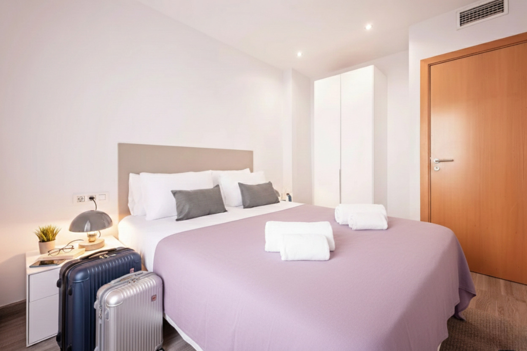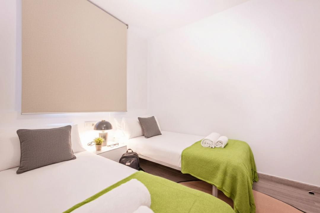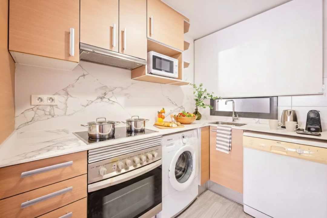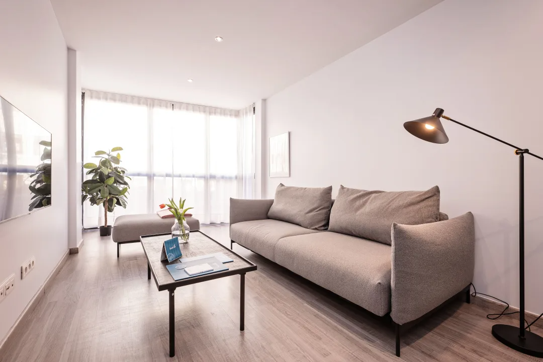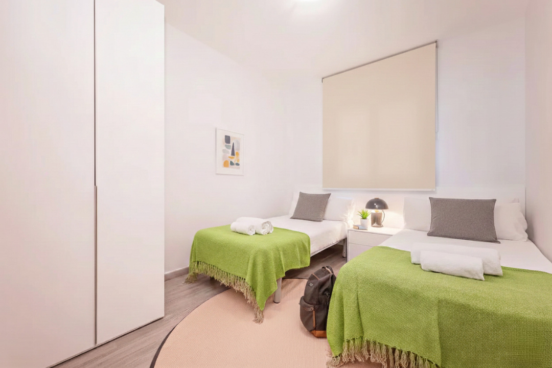 This delightful two-bedroom Acomodis apartment offers a cozy and inviting atmosphere, bathed in natural light. The fully equipped kitchen is ideal for cooking family meals, making it a fantastic option for both short and extended stays.
