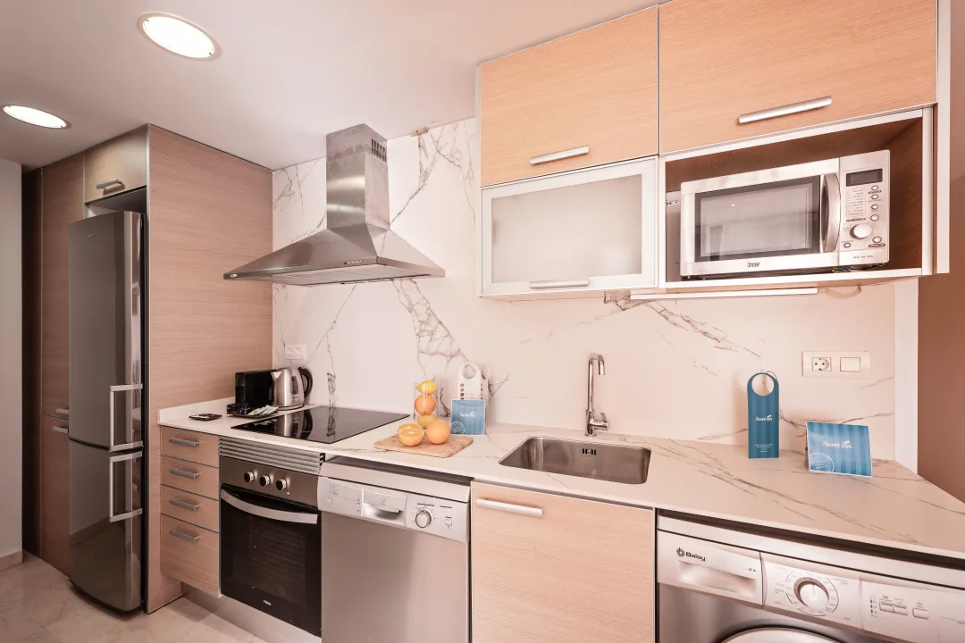 Each unit includes a modern kitchen with essential appliances, a cozy seating area, a flat-screen TV, a washing machine, and a private bathroom. For added convenience, bed linen and towels are provided.