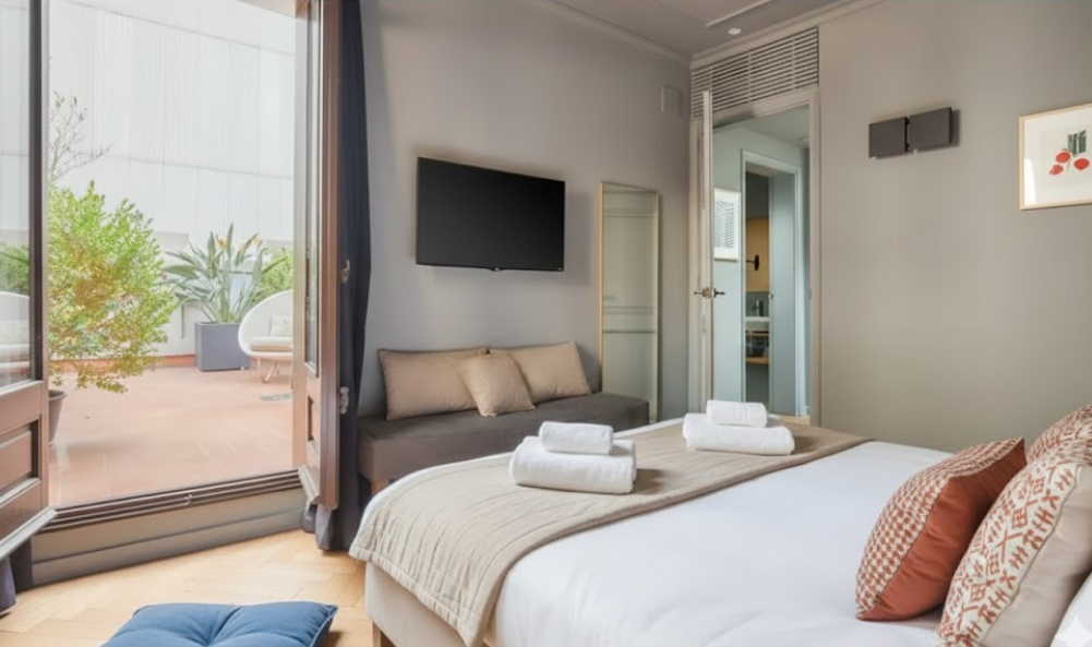 Experience the vibrant essence of Barcelona in this exquisite suite, perfectly nestled in the historic Gràcia district. The highlight of this property is the stunning private terrace, offering abundant natural light and breathtaking views of the charming surroundings. This space seamlessly blends modern elegance with historic charm, featuring a cozy, expertly designed bedroom that serves as your personal sanctuary after a day of city exploration.