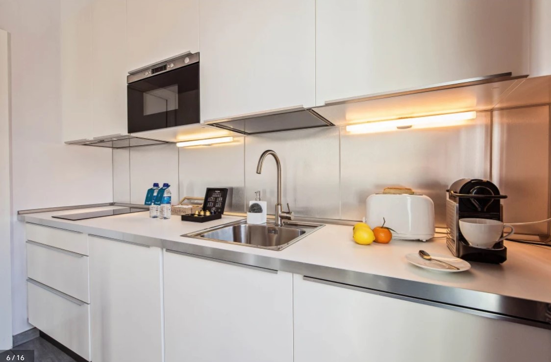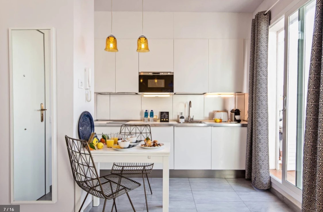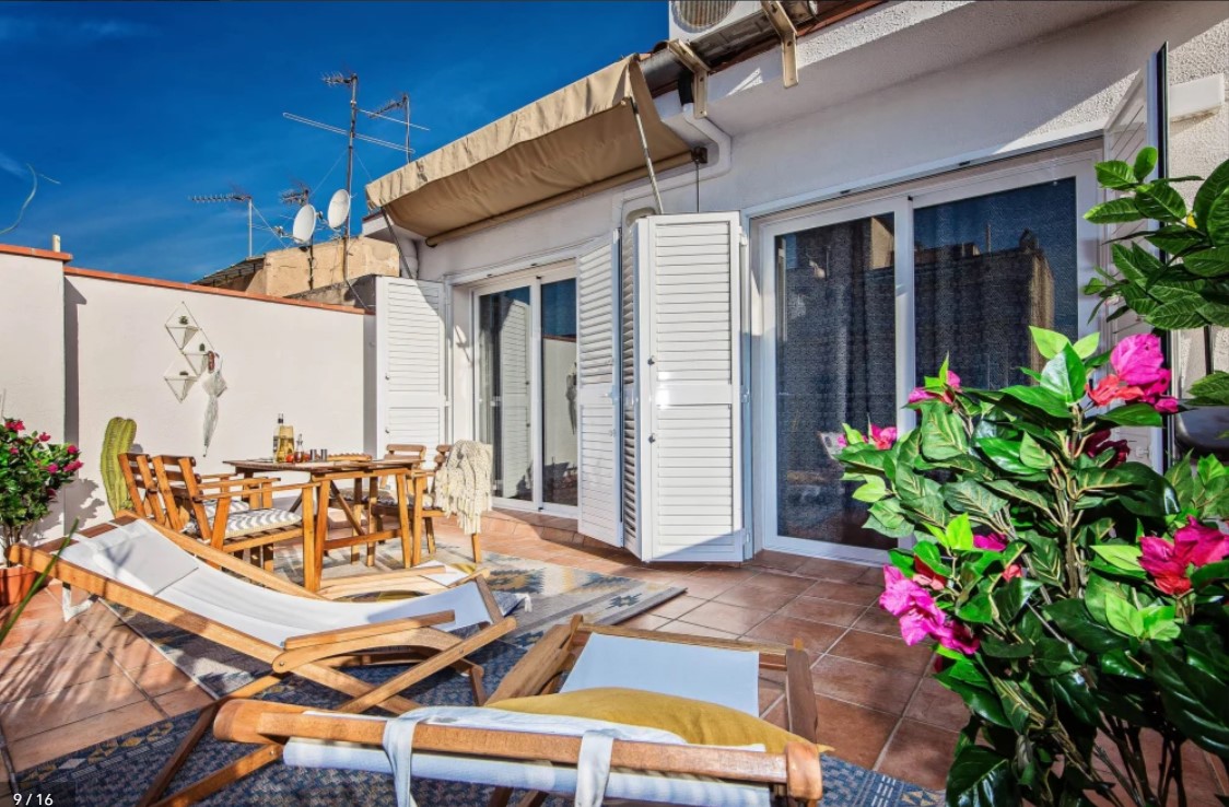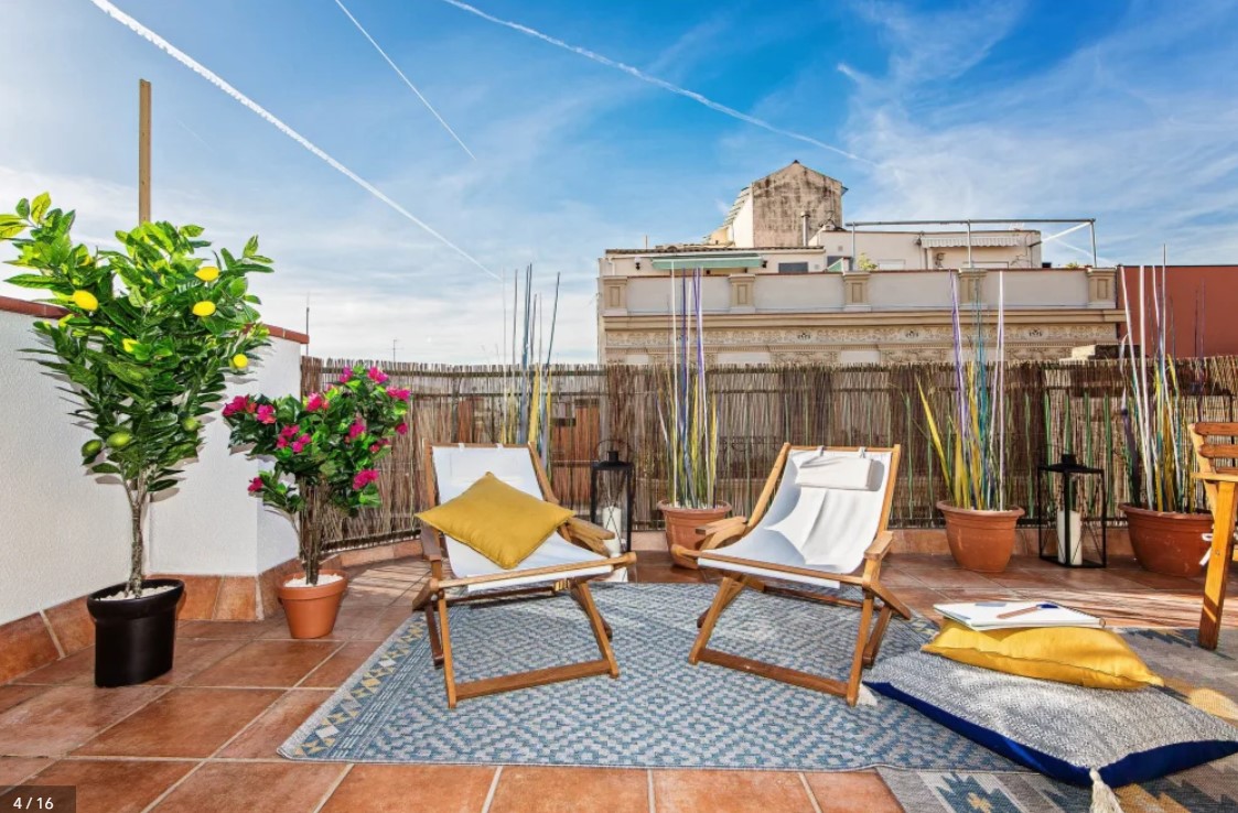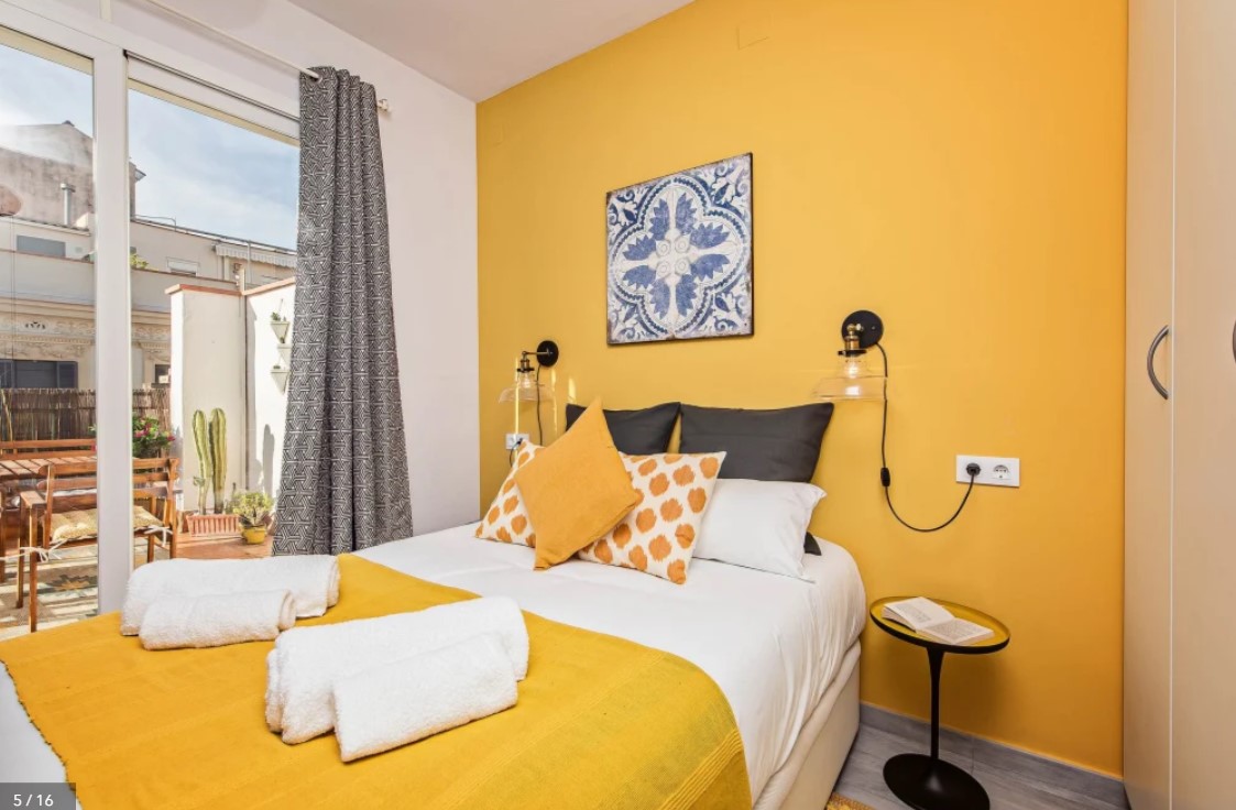 This bright studio has been decorated by our local interior designer for a sunny Spanish atmosphere. Painted with uplifting yellows and blues, this space is infused with the spirit of Barcelona. A wide private patio, spanning the entire apartment, gives you a stunning view of the whole city. The fresh white kitchen is a cozy spot for cooking a spicy Spanish meal, and the living spaces are full of natural light. Premium amenities include free WiFi, cable TV, high-end toiletries, hotel beds and linens, and a Nespresso machine.