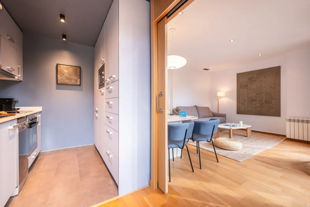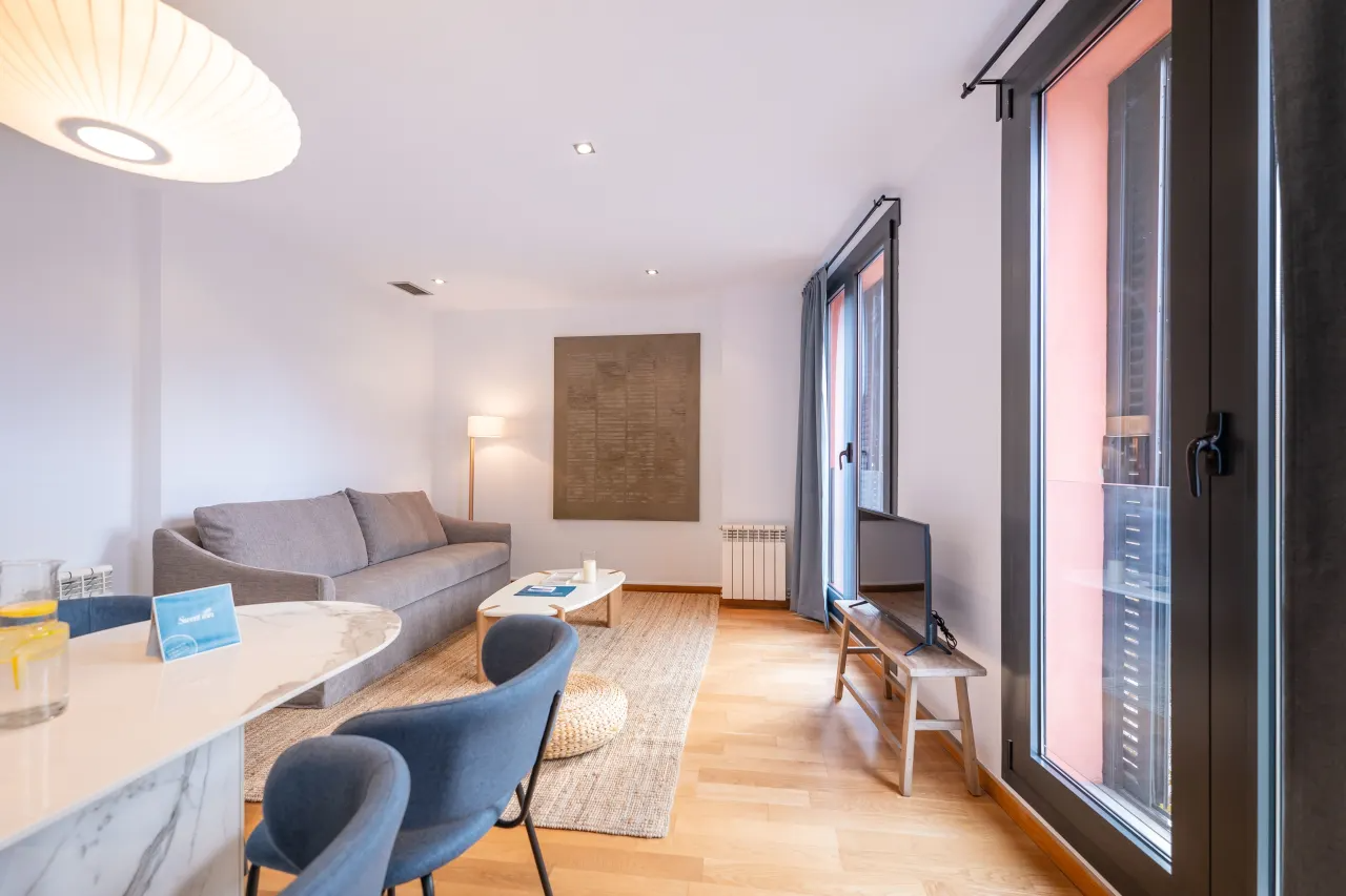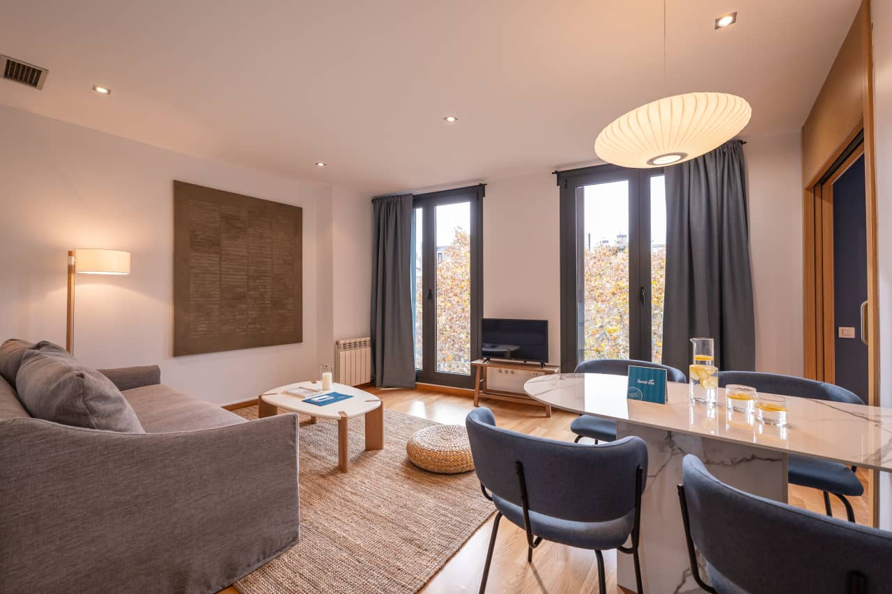 Located in the vibrant city center of Barcelona, this delightful two-bedroom Acomodis apartment invites you to immerse yourself in the essence of Spanish charm. Our local designer has created a space that beautifully combines contemporary style with a touch of modernity. The large windows offer stunning views of the city.