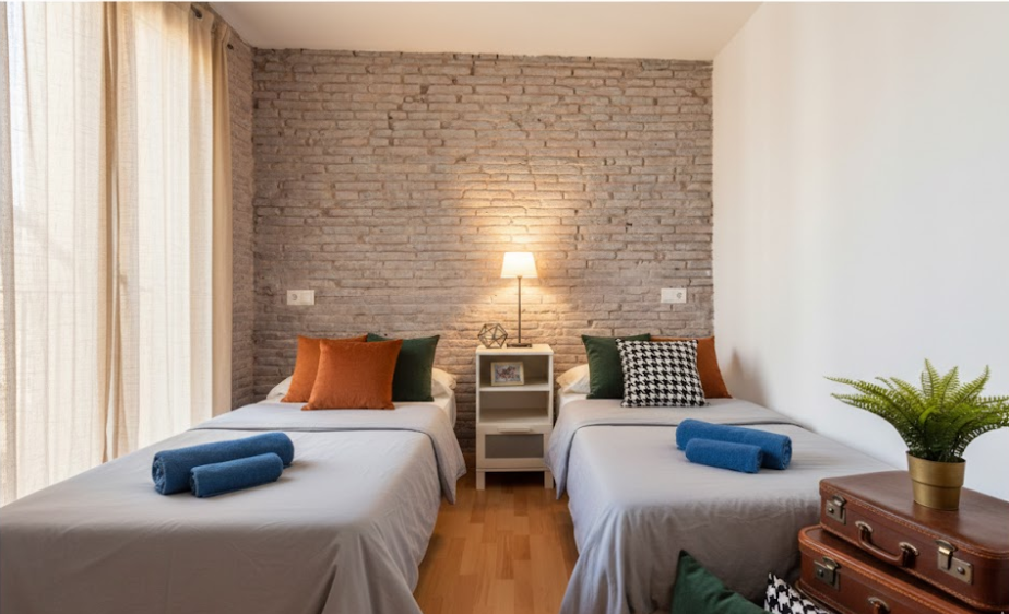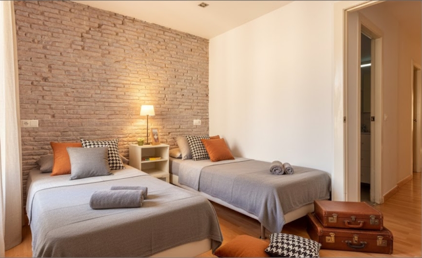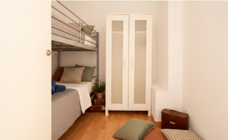 The quiet and charming rooms combine light tones with a nice rustic stonework decoration. In addition, the wide windows allow for plenty of natural light to flow in from the outside. This apartment of 55 m2 will provide you with everything you might possibly need. It can accommodate groups and families of up to six people. The apartment has two bedrooms, with two single beds that can be joined into a double bed in the main bedroom, and a bunk in the other.