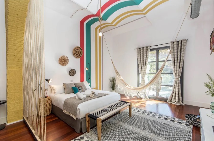 Located in a restored factory building, this hip studio has been decorated by our top local interior designer for an experience of Spanish culture and comfort. Bold colors, rustic furniture, and eclectic decor give the apartment a laid-back vibe. A reed divider separates the cozy bedroom and the inviting lounge area, huge windows fill the space with sunlight, and a hammock hangs from the ceiling. A state-of-the-art kitchen is perfect for a romantic dinner in. Premium amenities include free WiFi, cable TV, high-end toiletries, hotel beds and linens, and a Nespresso machine.