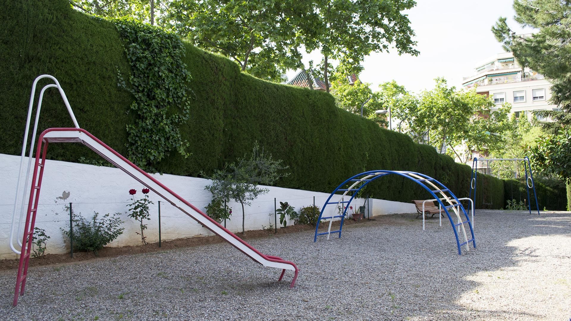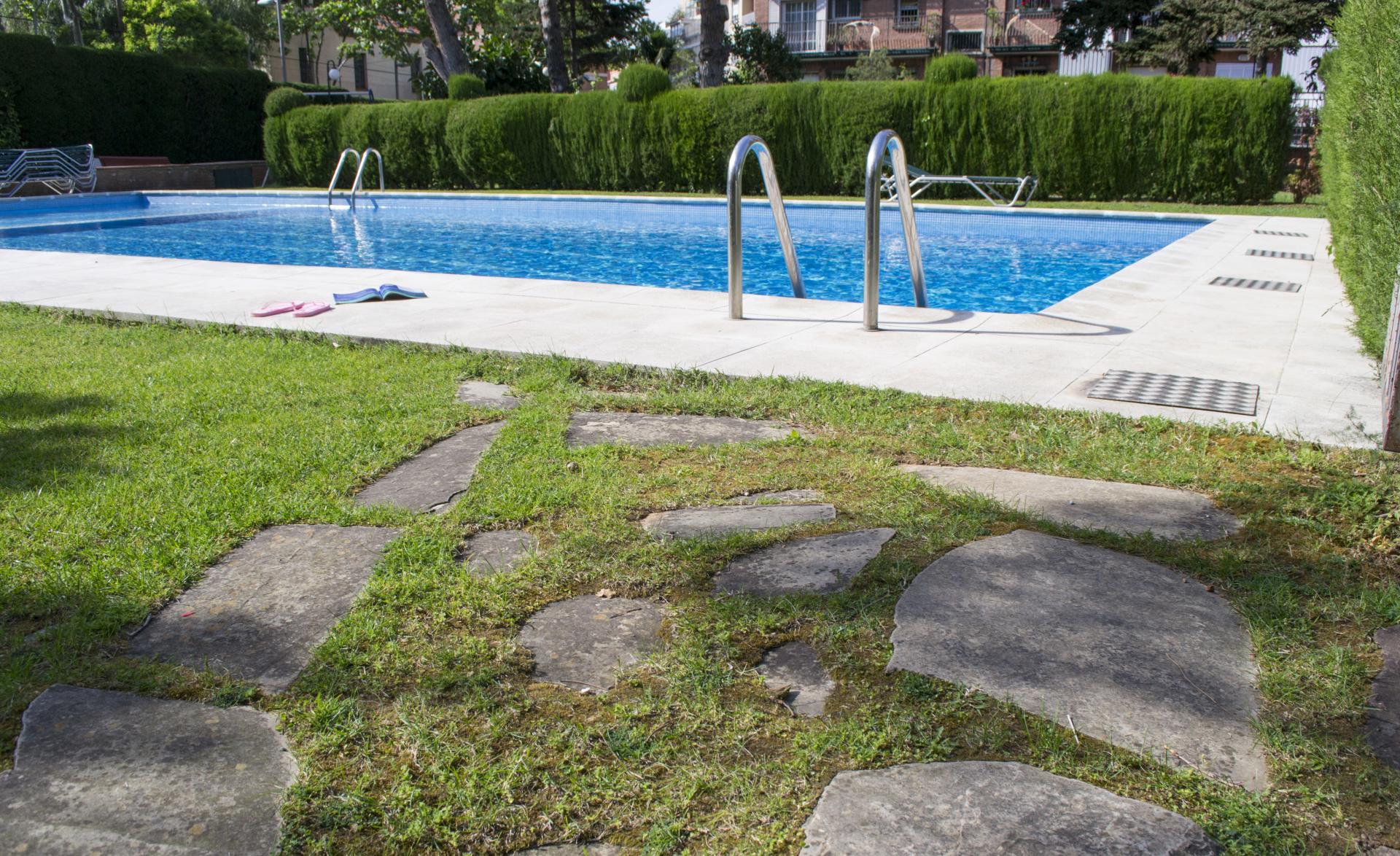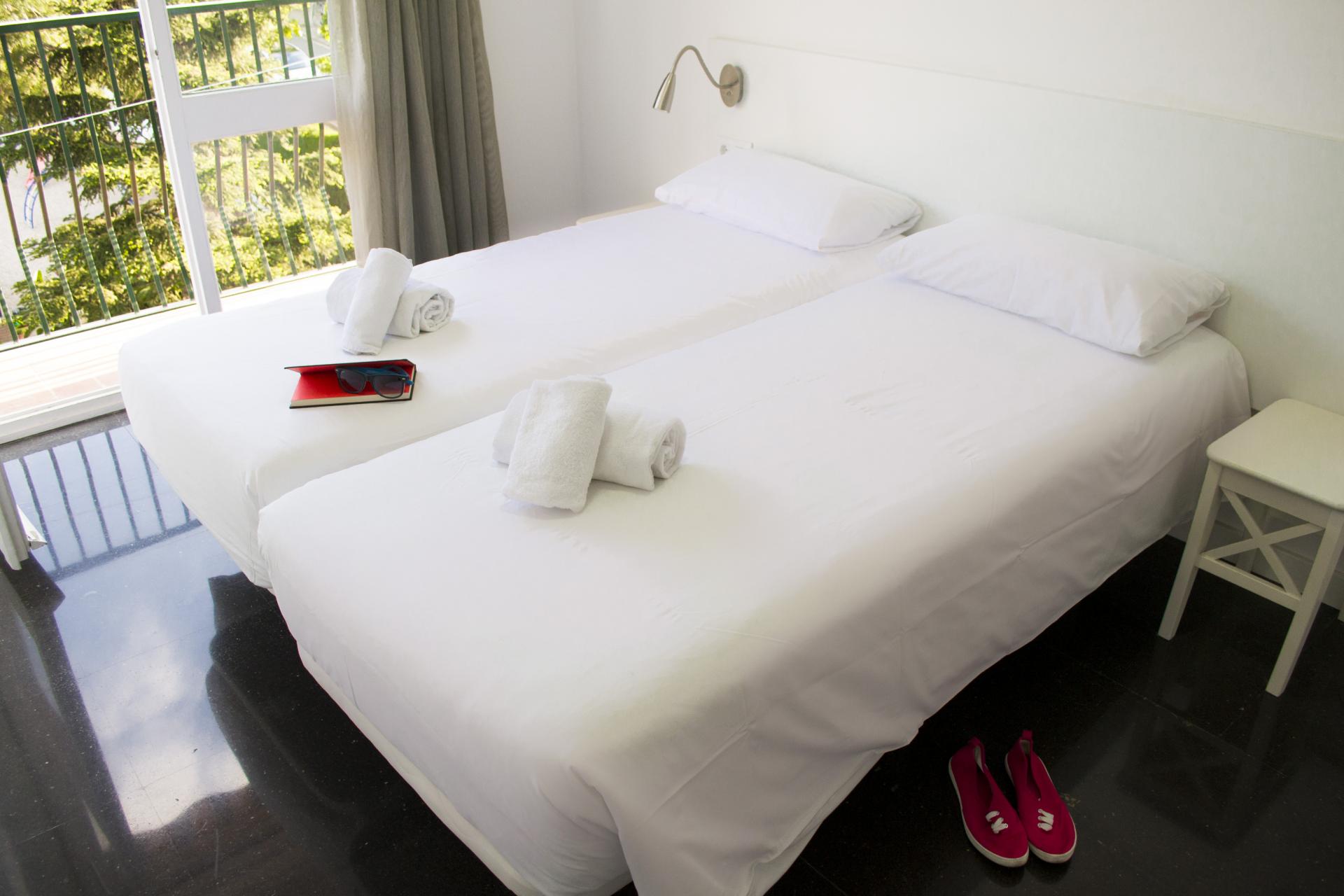 Hay 2 dormitorios dobles con baño en suite, un dormitorio con dos camas individuales y un dormitorio individual, además de otro baño. Los dormitorios tienen balcones con vistas al jardín del edificio.