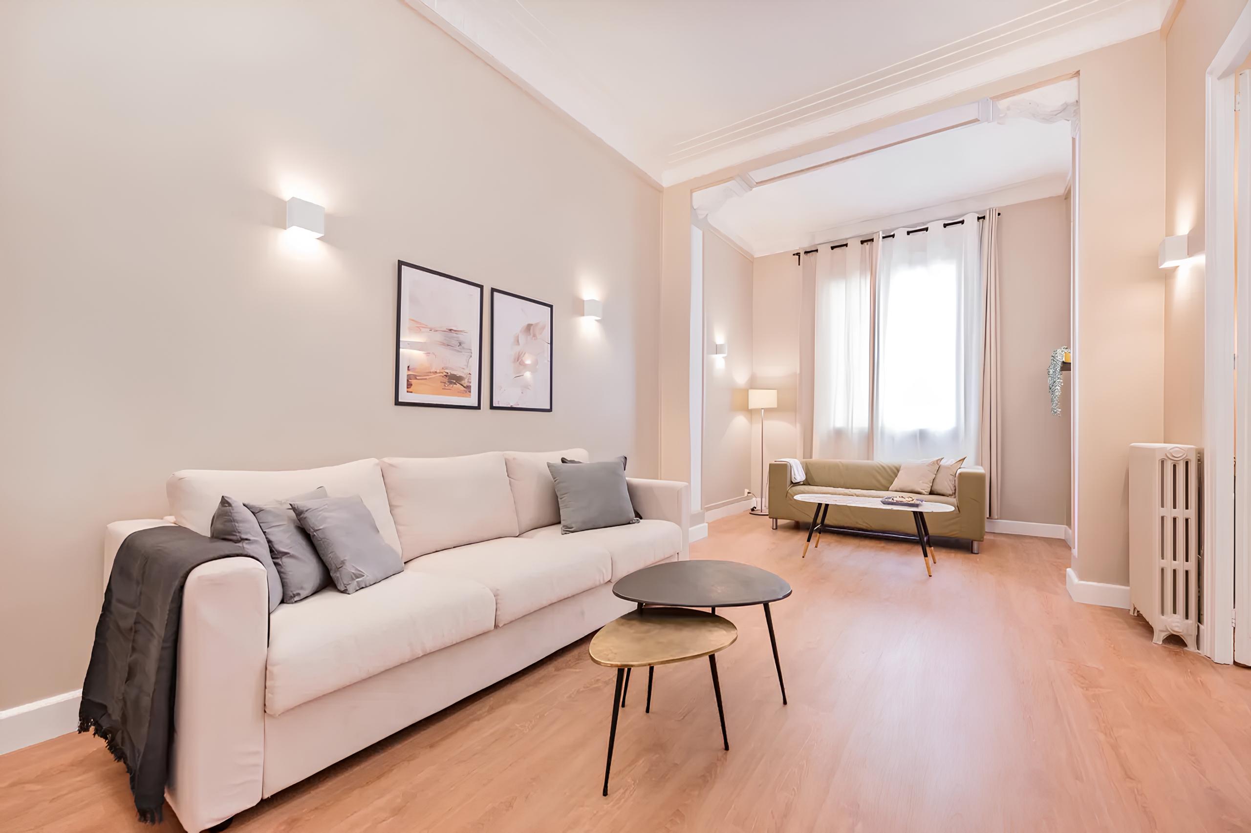 Step into the inviting charm of the Sepulveda apartment, where sleek Spanish design meets refined comfort. This elegant five-bedroom home features a tastefully styled living area, ideal for both unwinding and hosting. The fully equipped kitchen offers everything you need to prepare delicious meals and explore Spanish flavours at your own pace. Step out onto the sun-filled balcony, perfect for enjoying a refreshing drink under the Mediterranean sky.