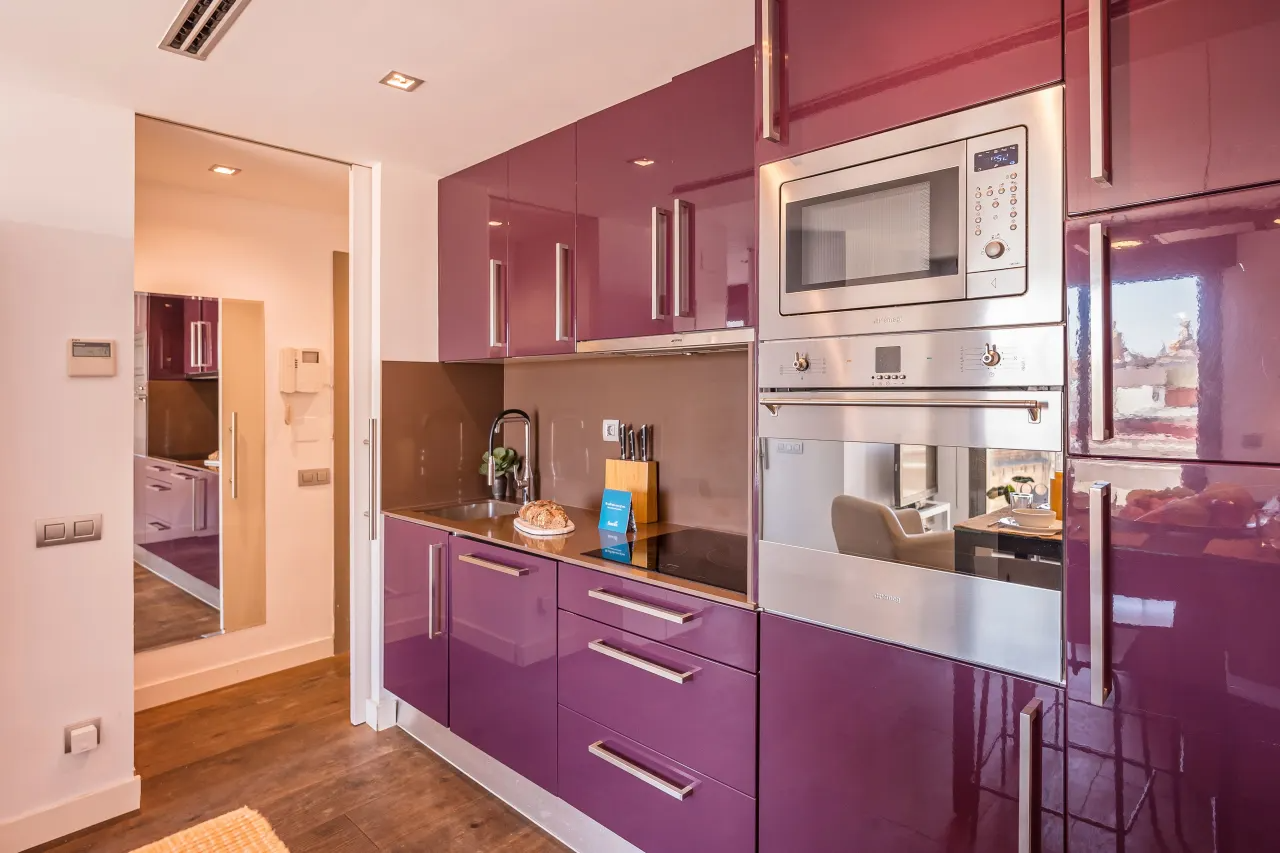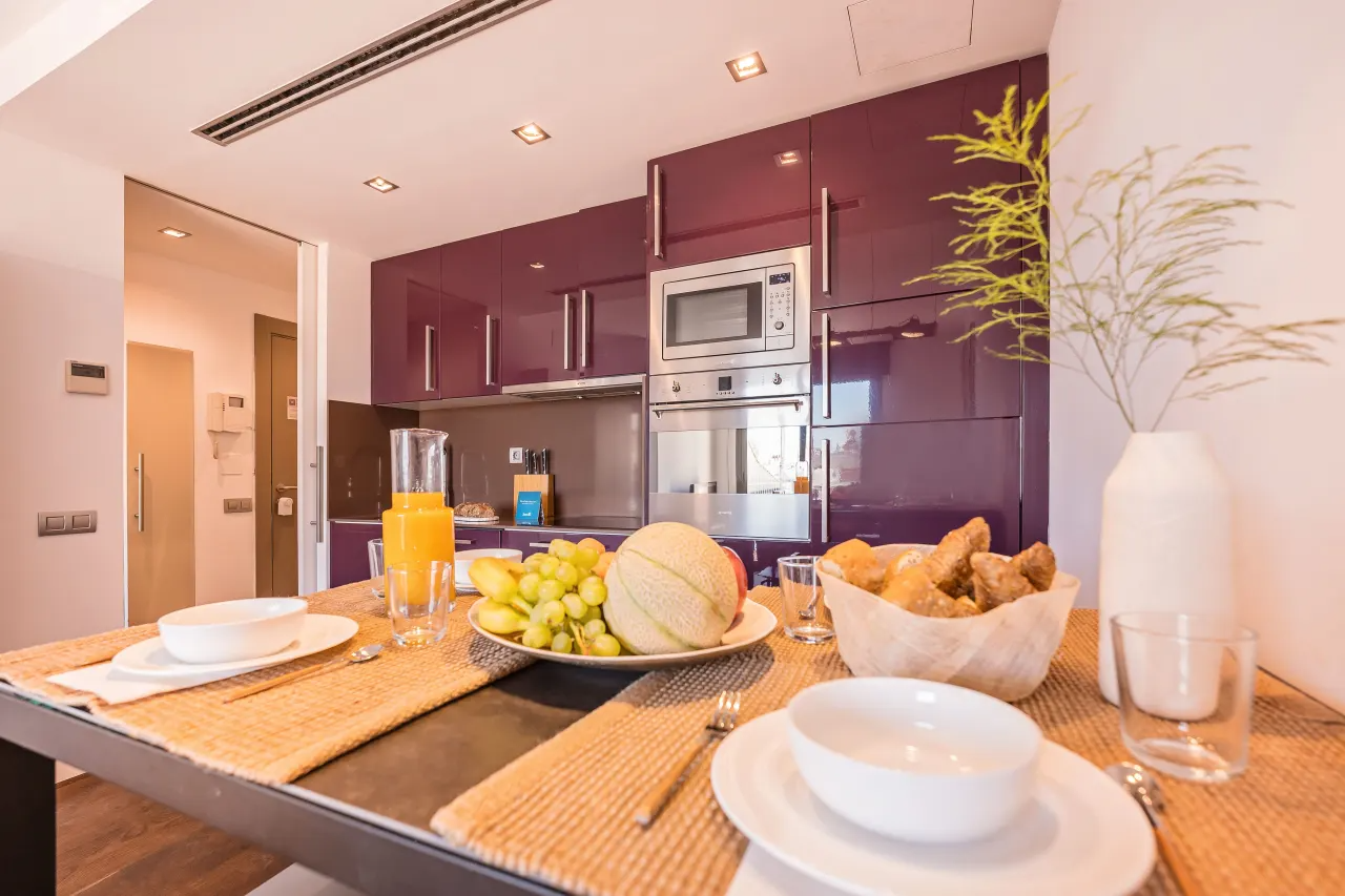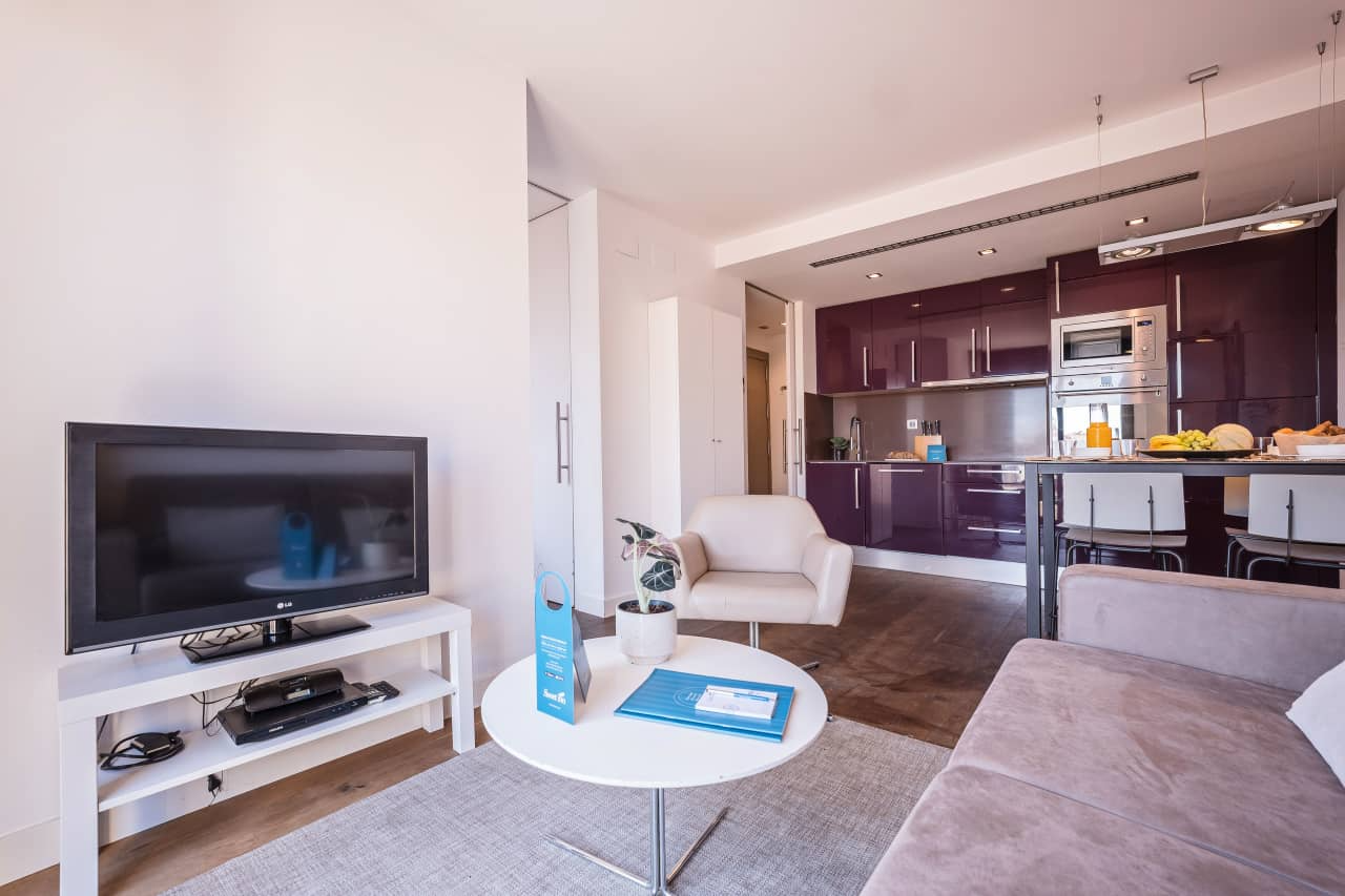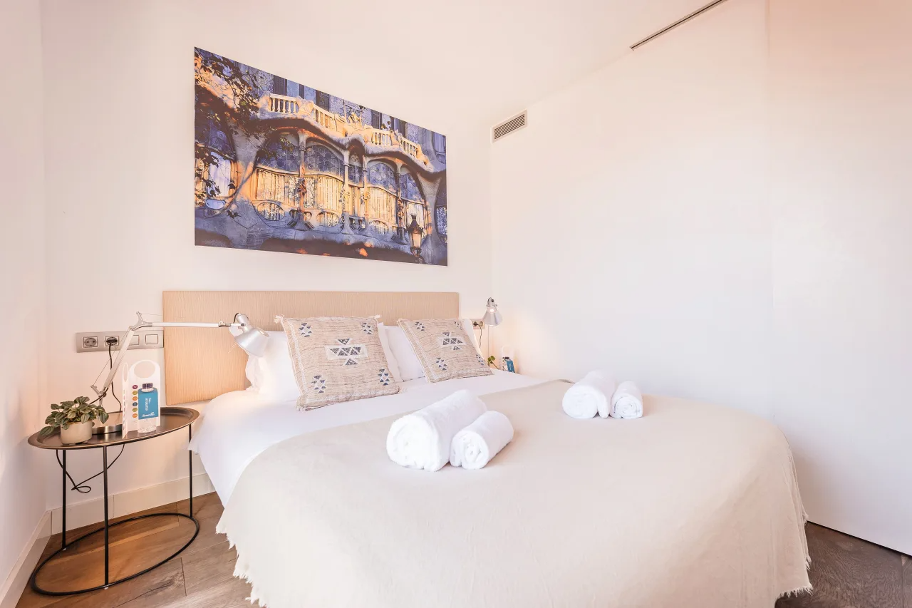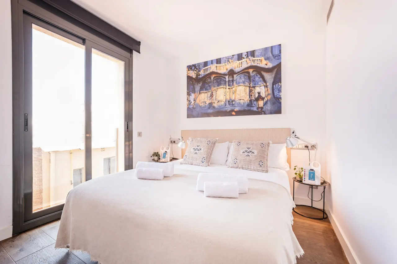 Nestled in the heart of Barcelona’s lively city center, this charming one-bedroom Acomodis apartment invites you to experience the essence of Spanish allure. Designed by a local artist, the space beautifully blends contemporary elegance with modern flair. With large windows that frame breathtaking views of the city, you'll feel immersed in the vibrant atmosphere.