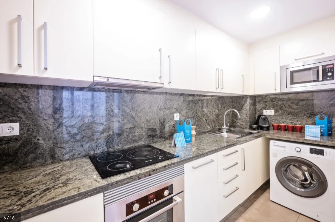 Each unit has a balcony, a fully equipped kitchen with a dishwasher, a seating area, a flat-screen TV, a washing machine, and a private bathroom with a bath or shower and a hair dryer. An oven and coffee machine are also featured.