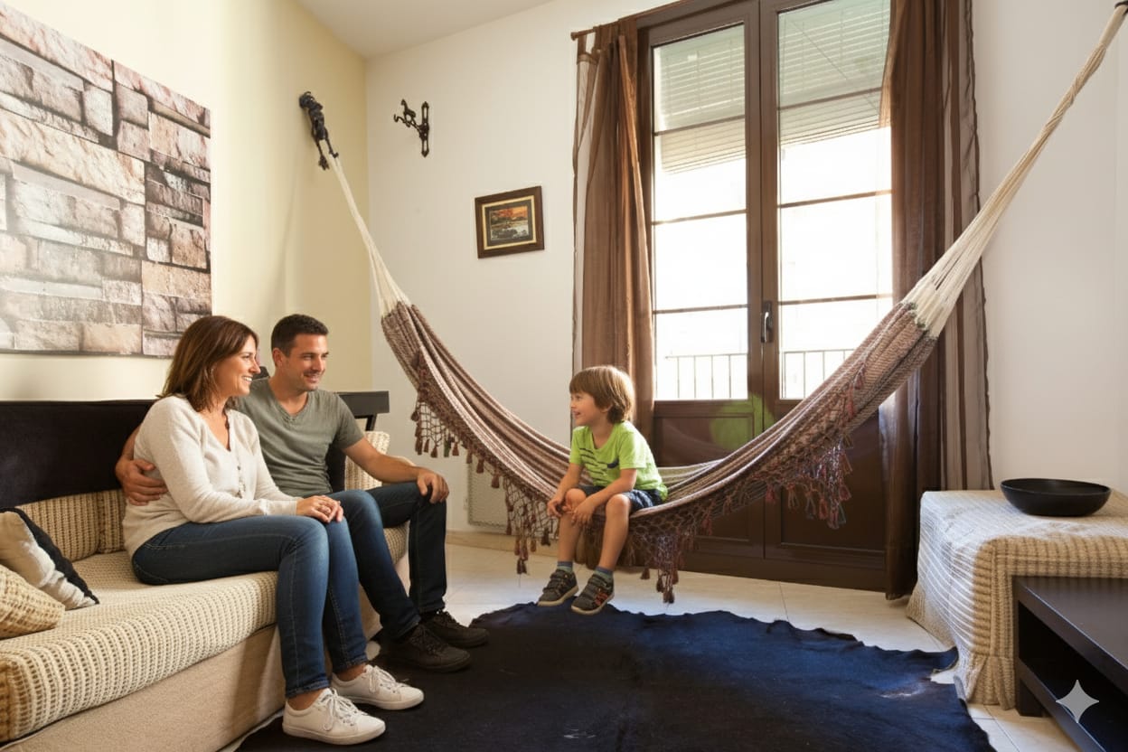 Es un espacio familiar que incluye pequeños juguetes y mobiliario infantil si hay niños.