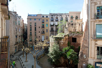 Ubicación ideal en el Barrio Gótico de Barcelona, que se encuentra en un edificio esquinero que da a una acogedora plaza pequeña enfrente de la antigua Muralla Romana.