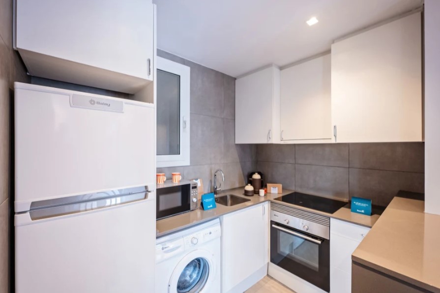 - Hervidor de agua (Kettle), Cocina vitrocerámica, Congelador, Horno eléctrico, Nevera, Microondas, Tostadora, Cafetera eléctrica