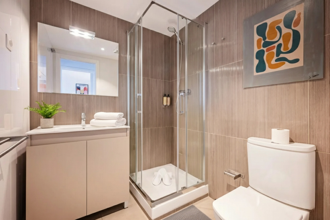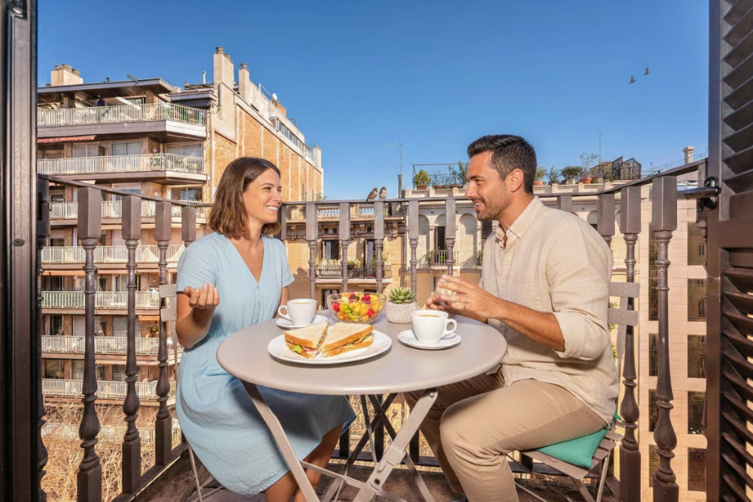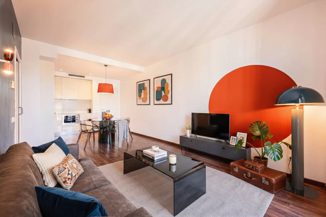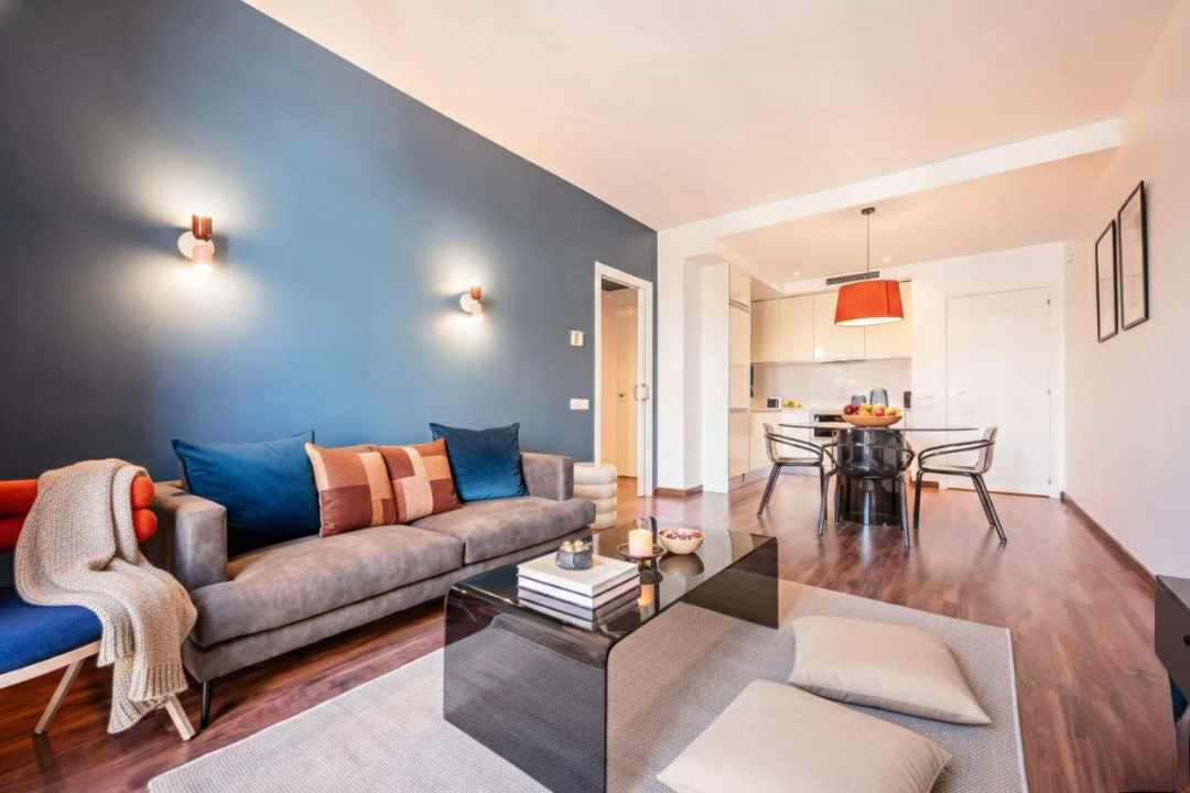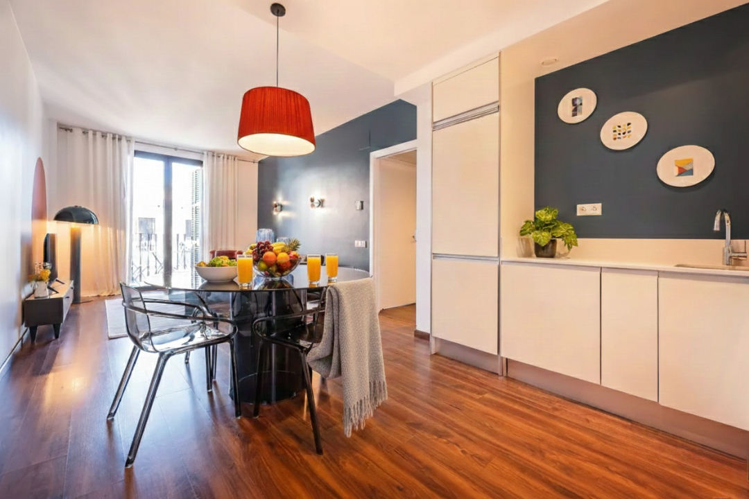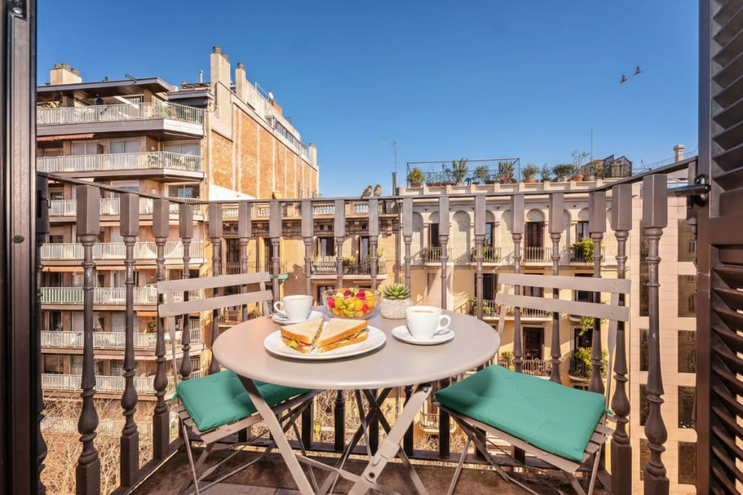 Ce spacieux appartement de 2 chambres avec 2 salles de bains offre une ambiance chaleureuse et accueillante, avec beaucoup de lumière naturelle provenant des fenêtres. Détendez-vous avec une boisson rafraîchissante ou profitez du soleil sur le grand patio après une journée de visites. La cuisine est entièrement équipée et idéale pour préparer des repas en famille. Situé au cœur de Barcelone, de nombreux sites célèbres de la ville comme la Sagrada Familia et la Plaza Catalunya sont accessibles à pied.