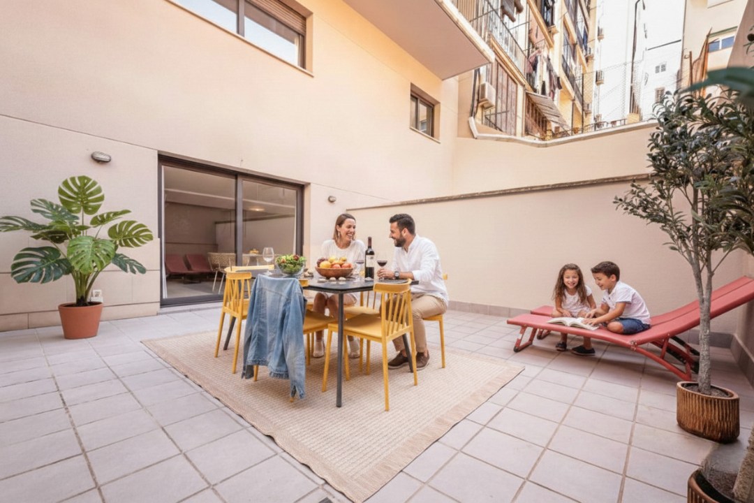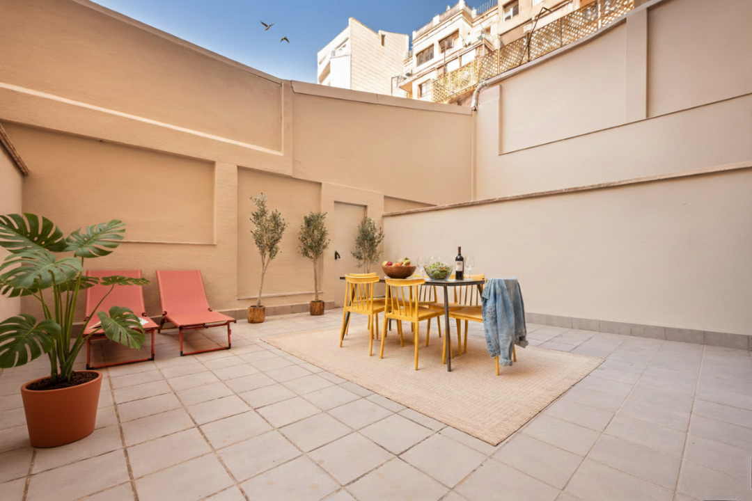 Ce spacieux appartement de 3 chambres avec 3 salles de bains offre une ambiance chaleureuse et accueillante, avec beaucoup de lumière naturelle provenant des fenêtres. Détendez-vous avec une boisson rafraîchissante ou profitez du soleil sur le grand patio après une journée de visites. La cuisine est entièrement équipée et idéale pour préparer des repas en famille. Situé au cœur de Barcelone, de nombreux sites célèbres de la ville comme la Sagrada Familia et la Plaza Catalunya sont accessibles à pied.