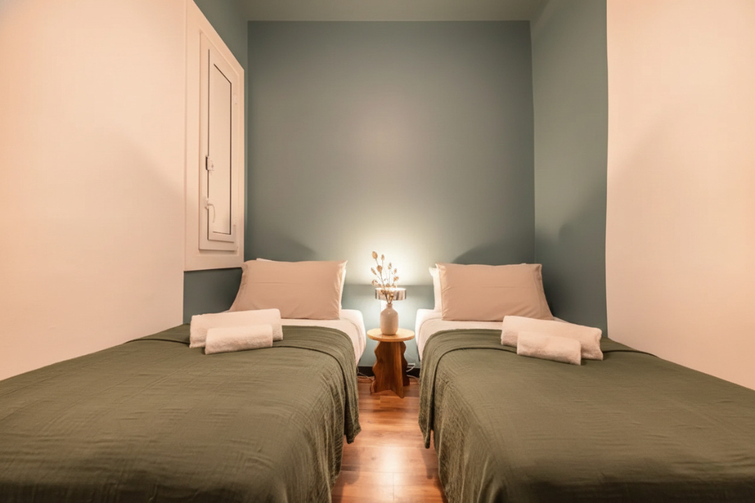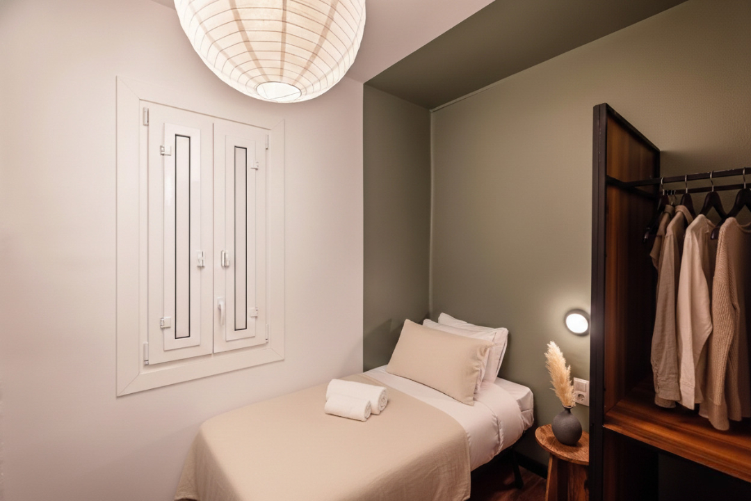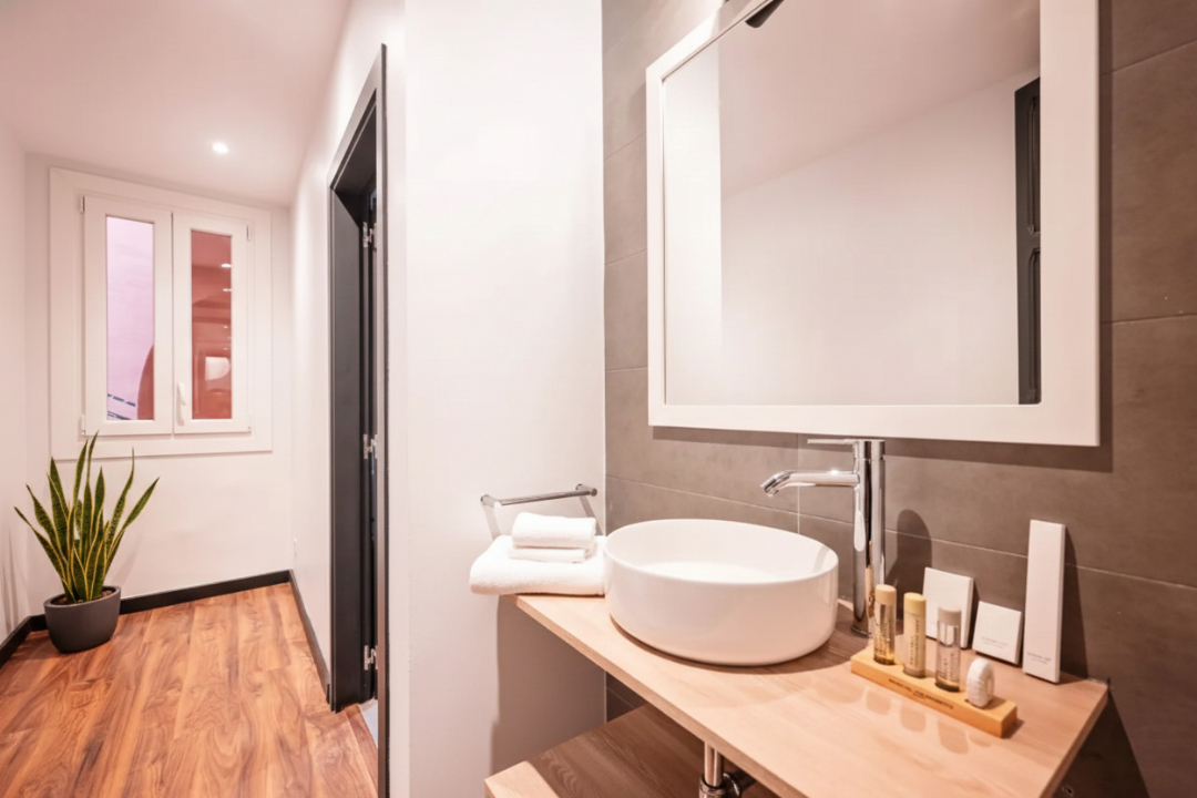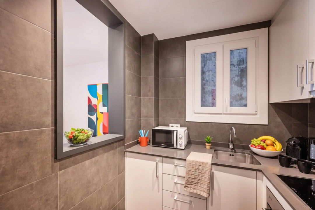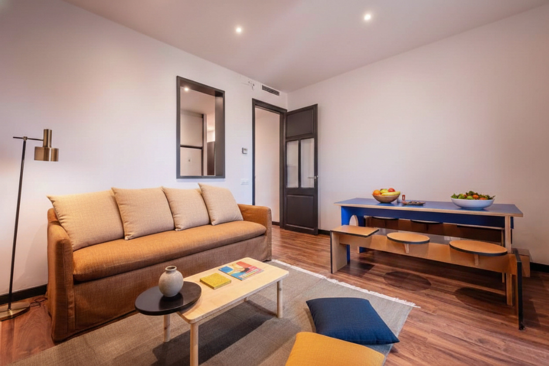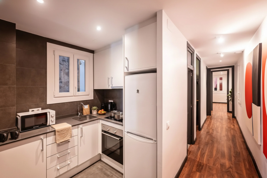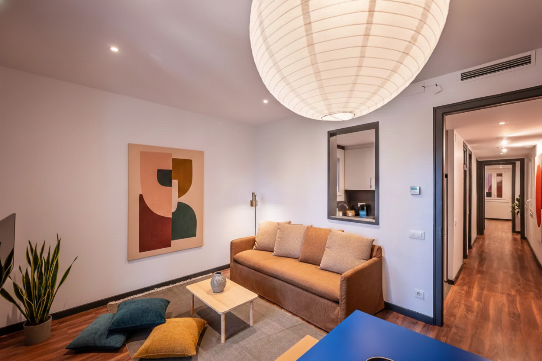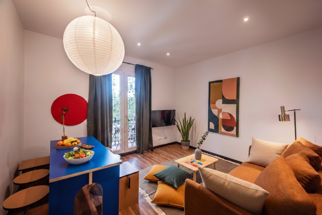 Denne trendy leiligheten med tre soverom inviterer deg til å bo i Barcelona som en ekte lokalbefolkning. Interiørdesigneren vår har omhyggelig dekorert stedet og tilbudt det et friskt moderne utseende. Kjøkkenet er fullt utstyrt og flott for å tilberede familiemåltider.